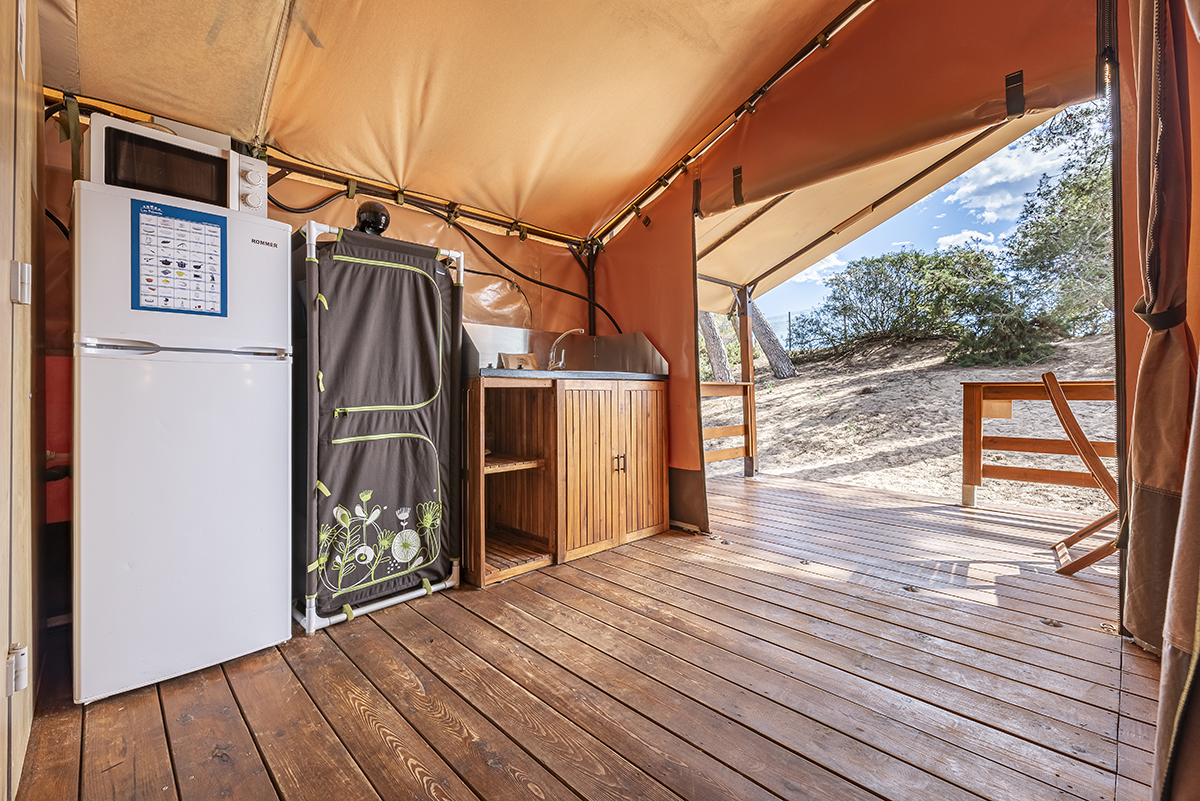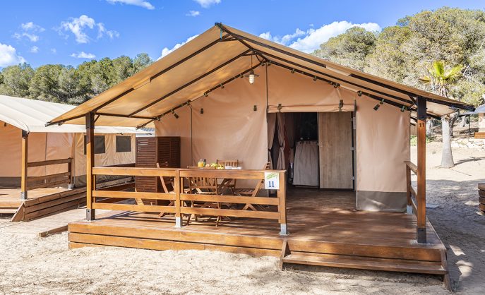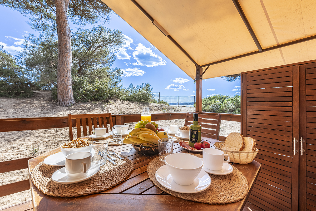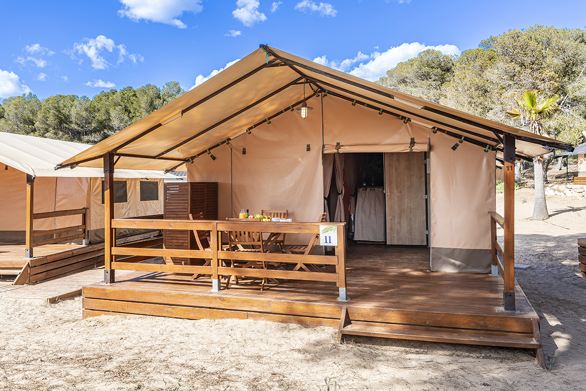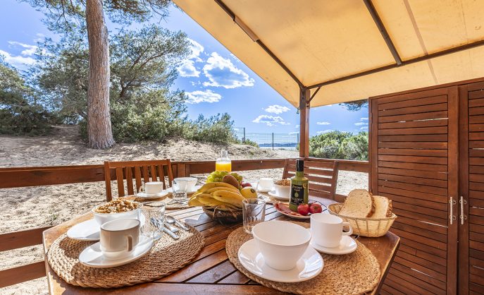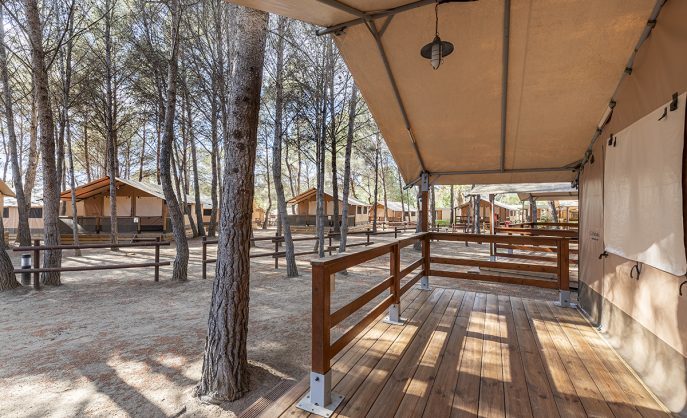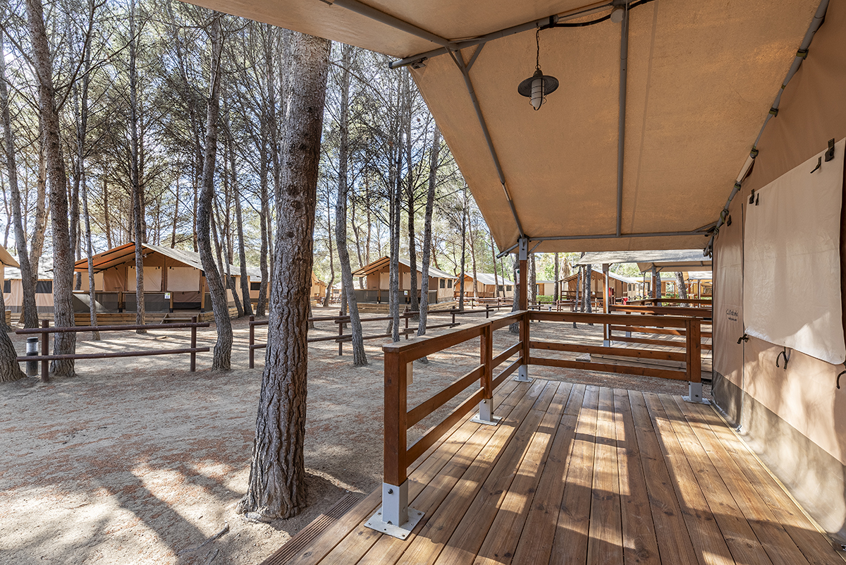 Area di tende familiari situata nel bosco del parco naturale di Punta de la Móra a Tarragona (Costa Dorada)